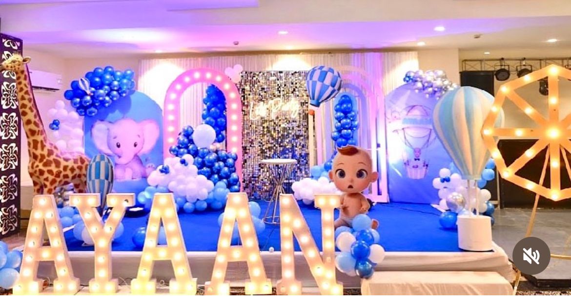 - Balloons on Backdrop as shown in the image (Blue & Silver chrome with white latex)